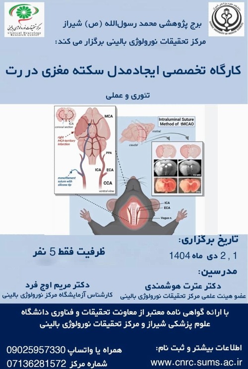 کارگاه تخصصی ایجاد مدل سکته مغزی در رت کارگاه تخصصی ایجاد مدل سکته مغزی در رت در تاریخ 1 تا 2 دی ماه 1404 در مرکز تحقیقات نورولوژی بالینی شیراز برگزار می گردد. گروه خبری : اخبار و اطلاعیه ها کد خبری : 141617 کپی کلیدواژه
